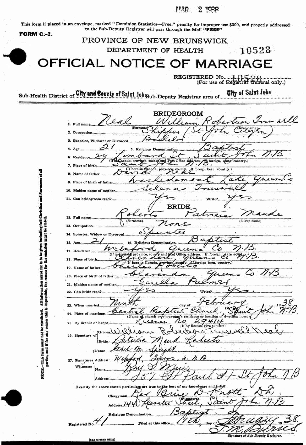 | Married | 9 Feb 1938 | Saint John, Saint John, New Brunswick |