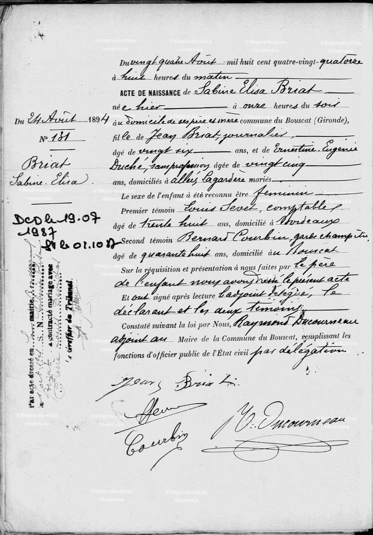 | Father | Jean BRIAT, b. 6 Oct 1868, Saillac, Corrèze, France | |