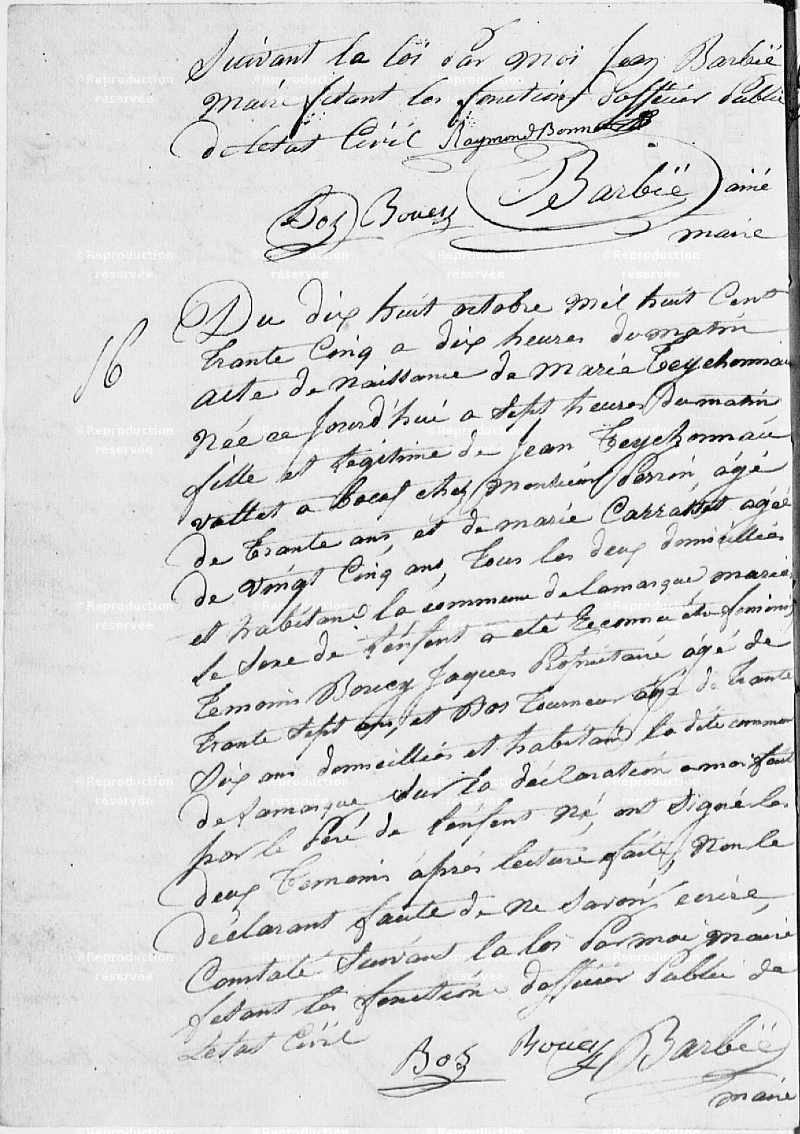 Devant nous Jean Barbié, Maire et Officier de l’État Civil de la Commune de Lamarque, se sont présentés en la Maison Commune pour être unis par le Mariage.