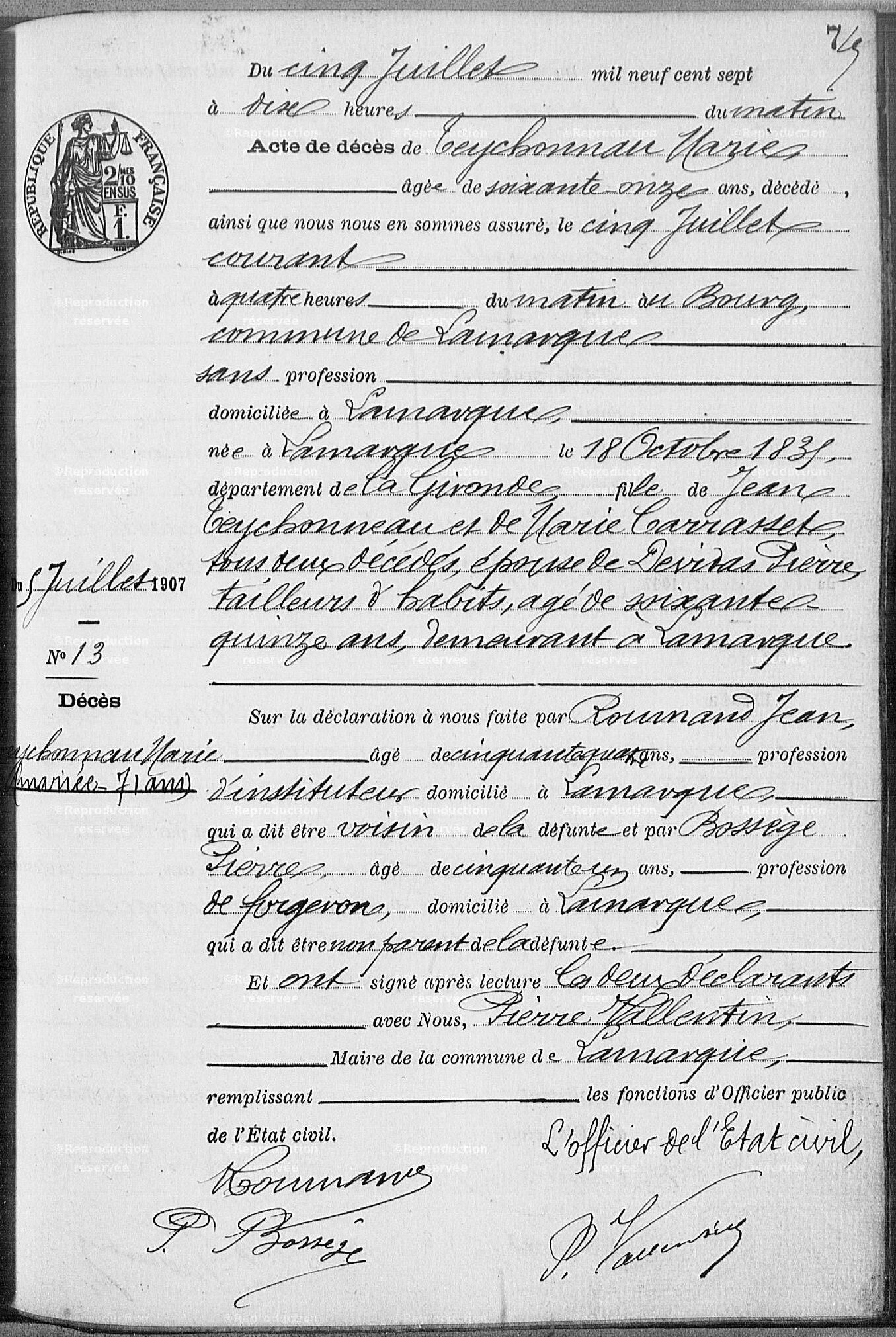 Marie Teychonneau, née à Lamarque le dix-huit octobre mil huit cent trente-cinq, y demeurant avec ses père et mère, fille majeure et légitime de Jean Teychonneau, propriétaire, présent et consentant et Marie Carrasset, sans profession, présente et consentante.