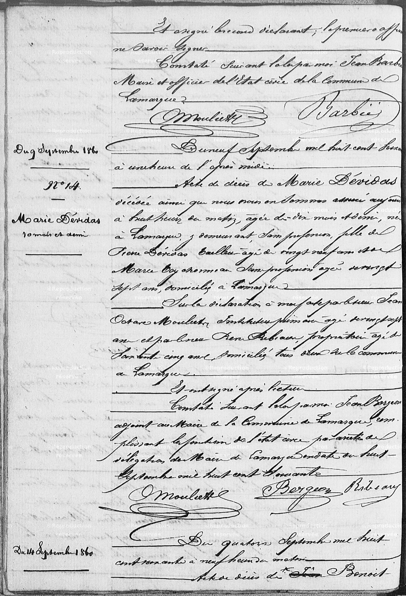 Marie Dévidas, décédée ainsi que nous nous en sommes assuré aujourd’hui à huit heures du matin, âgee de six mois et demi, née à Lamarque, y demeurant, sans profession, fille de
