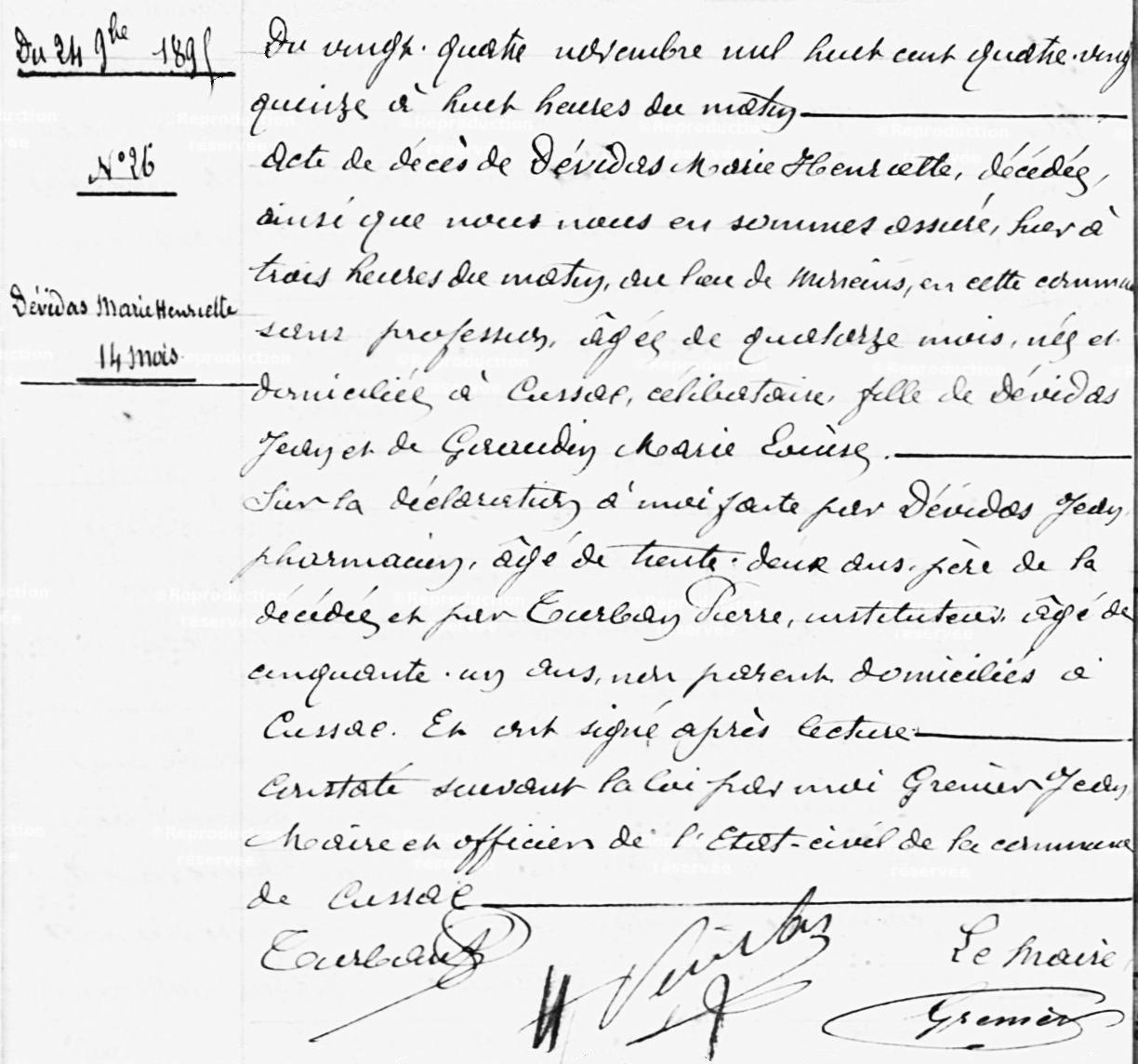 Constaté suivant la loi par moi Grenier Jean, maire et officier public de l’État-civil de la commune de Cussac.