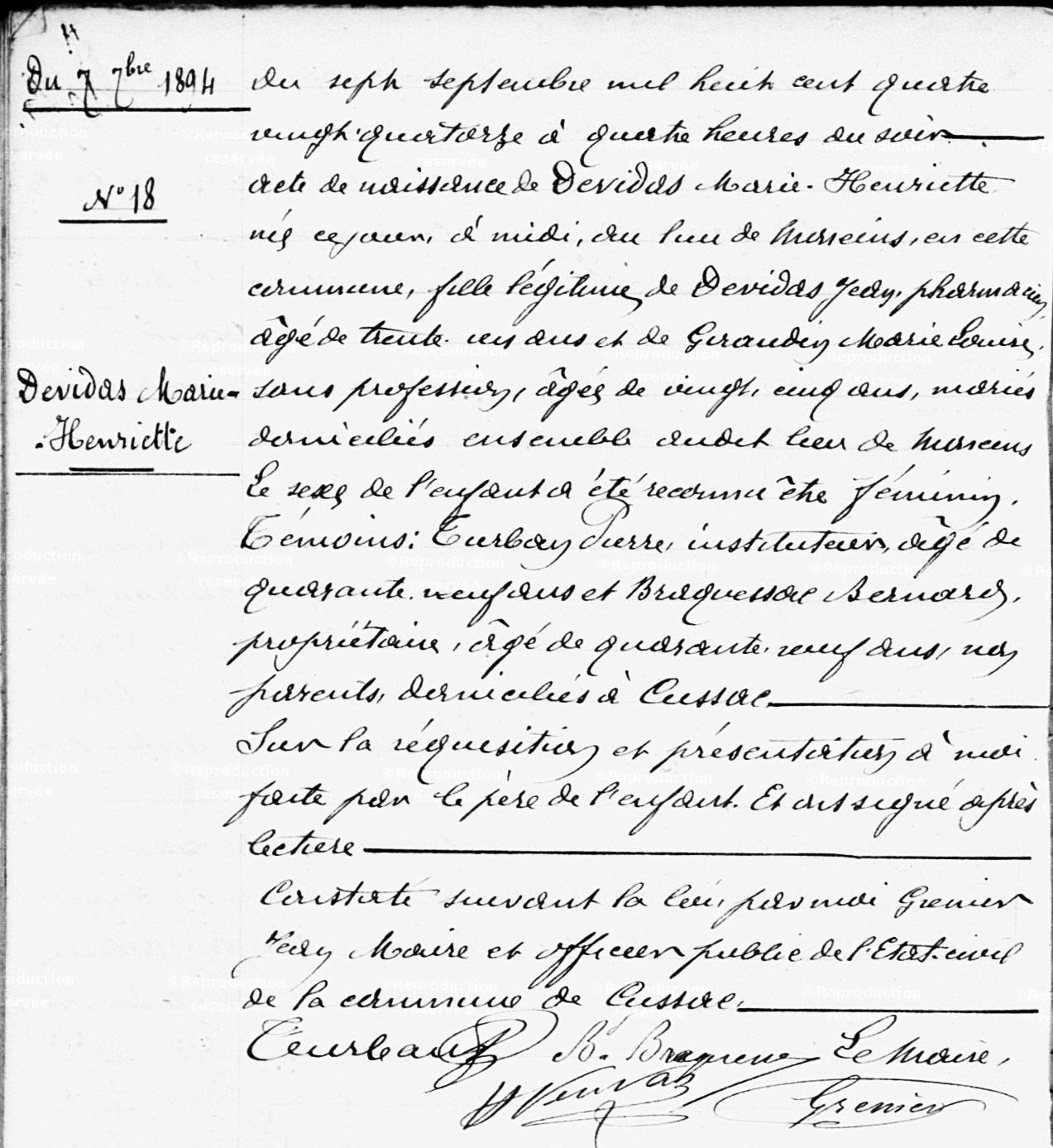 Du sept septembre mil huit cent quatre-vingt-quatorze à quatres heures du soir. Acte de naissance de