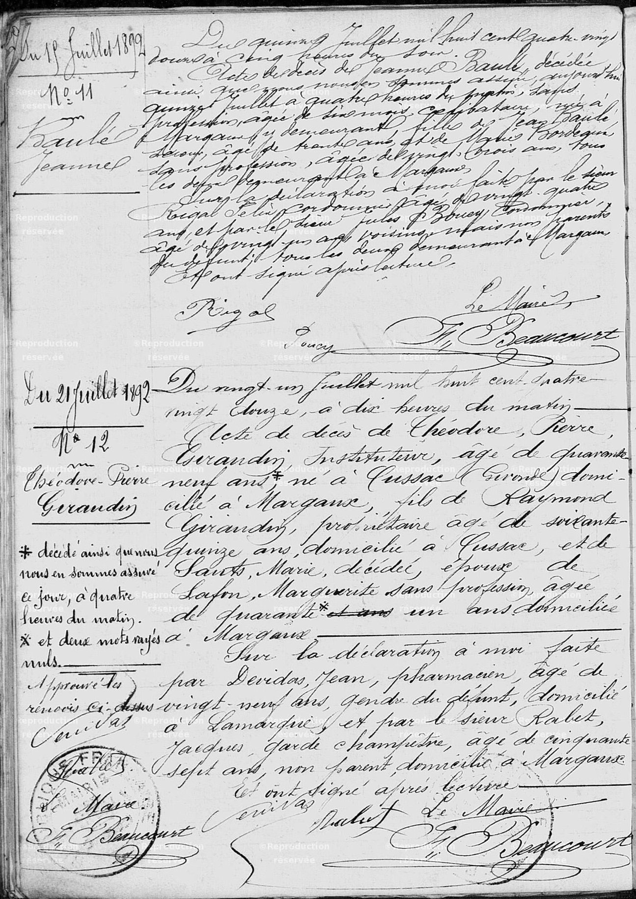 Après avoir donné aux parties et aux personnes qui les assistaient lecture des pièces ci-dessus mentionnées et du chapitre six du titre cinq du Code Napoléon, nous avons reçu des contractants, l’un après l’autre, la déclaration qu’ils veulent se prendre pour époux, et avons prononcé publiquement, au nom de la loi, que Monsieur Pierre Giraudin et demoiselle Marguerite Lafon sont unis par le mariage, dont acte fait en présence du père et de la mère de l’époux, consentant et de messieurs Pierre Gaillac, âgé de trente ans, journalier, rue Laroche 3, Arnaud Jouin âgé de vingt-cinq ans, employé, rue Caribou 12, François Martet âgé de quarante-cinq ans, chapelier rue Ste Catherine 51 et Pierre Chavany âgé de trente-cinq ans, grillageur, rue Galeillans 15. Lecture faite du présent, les époux, le père et la mère de l’époux, le grand-père de l’épouse et les témoins ont signé avec nous.