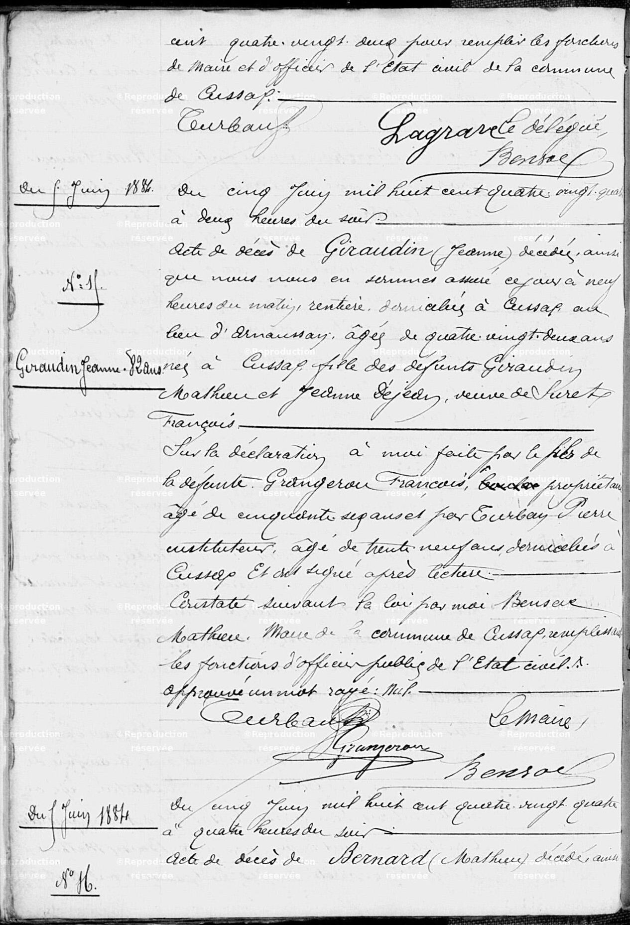 Giraudin (Jeanne), décédée, ainsi que nous nous en sommes assuré ce jour à neuf heures du matin, rentière, domiciliée à Cussac aux lieu d’Arnaussay, âgée de quatre-vingt-deux ans, née à Cussac, fille des défunts