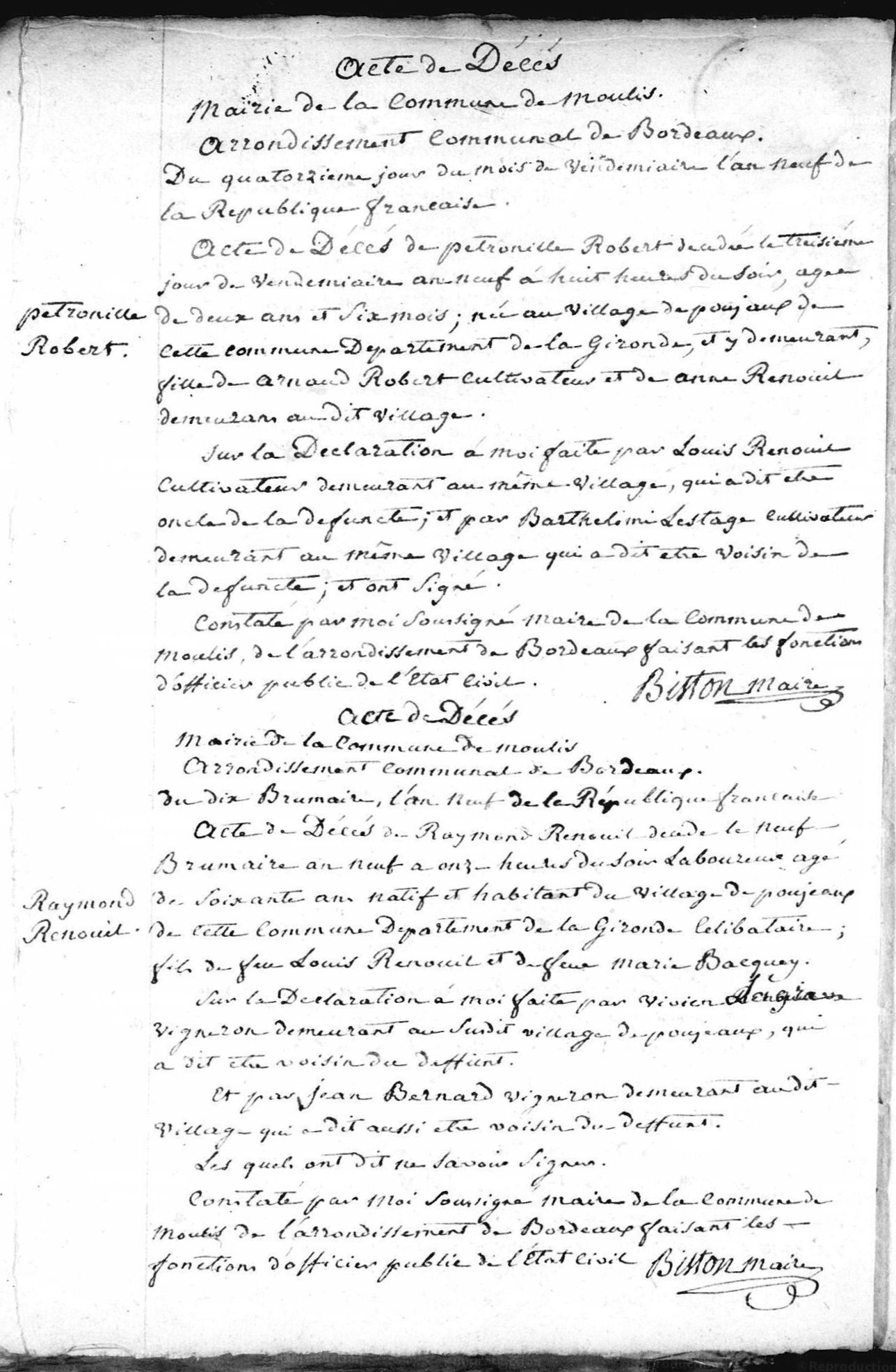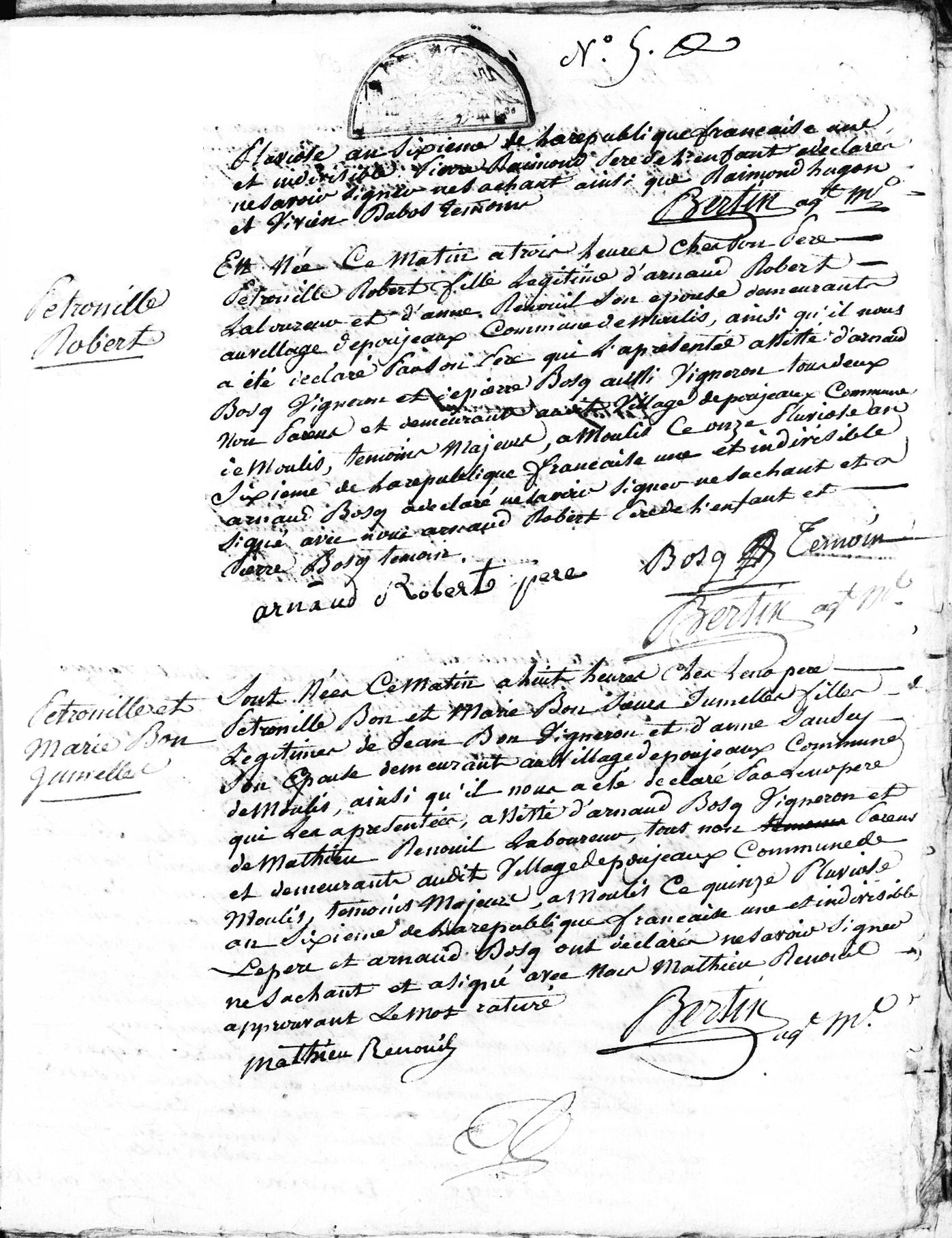 Anne Renouil son épouse demeurant au village de Poujeaux, commune de Moulis, ainsi qu’il nous a été déclaré par son père qui l’a présentée, assisté d’Arnaud Bosq, vigneron, et de Pierre Bosq, aussi vigneron, tous deux non parents et demeurant audit village de Poujeaux, commune de Moulis, témoins majeurs. À Moulis le onze pluviôse an sixième de la République française une et indivisible. Arnaud Bosq a déclaré ne savoir signer ne sachant ; et ont signé avec nous Arnaud Robert, père de l’enfant, et Pierre Bosq, témoin.