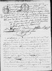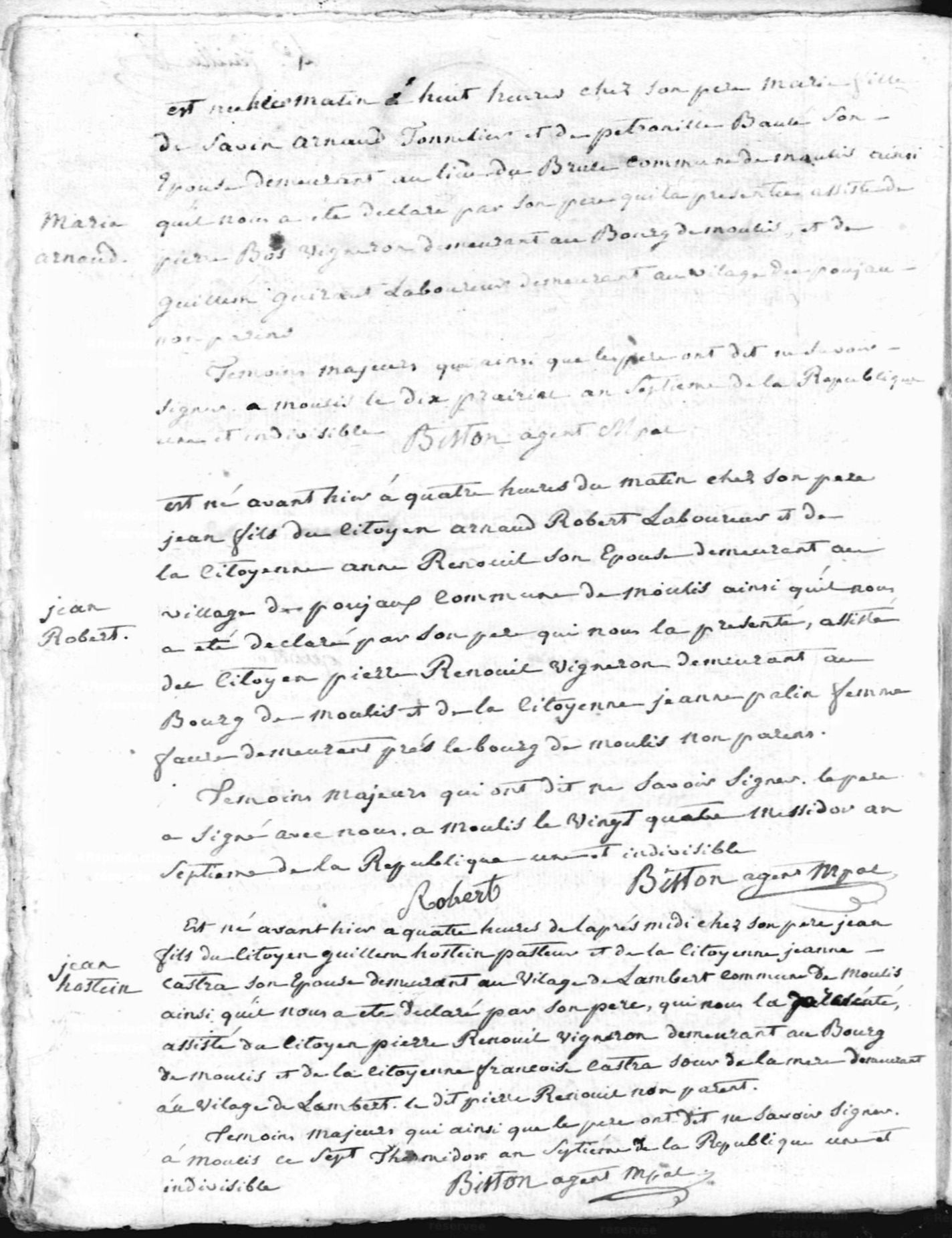 Anne Renouil, son épouse demeurant au village des Poujaux, commune de Moulis, ainsi qu’il nous a été déclaré par son père qui nous l’a présentée, assisté du citoyen Pierre Renouil, vigneron, demeurant au Bourg de Moulis et de la citoyenne Jeanne Palin, femme Faure, demeurant près le Bourg de Moulis, non parents. Témoins majeurs qui ont dit ne savoir signer. Le père a signé avec nous. À Moulis, le vingt-quatre messidor an septième de la République une et indivisible.