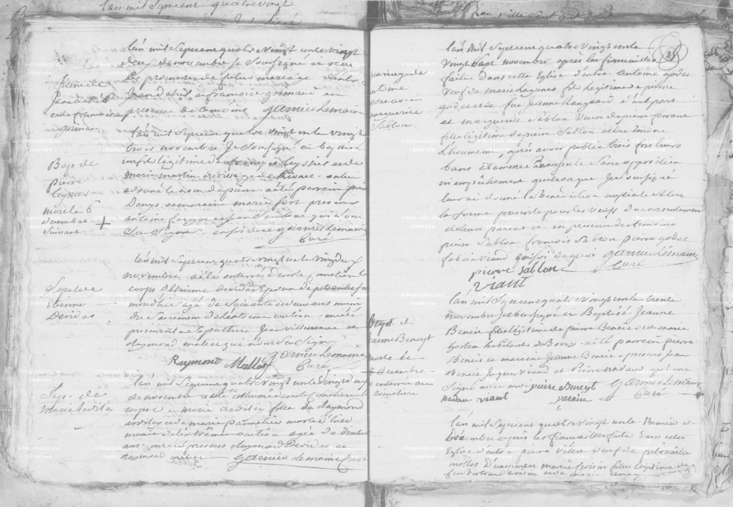 L’an mil sept cent quatre-vingt-un, le vingt-deux novembre, a été enterré dans le cimetière le corps d’ Etienne Devidas, époux de Pétronille Fort. Mort hier, âgé de soixante et un ans, muni du sacrement d’extrême-onction. On été présents à la sépulture, Jean Villeneuve et Raymond Malier qui n’ont su signer.