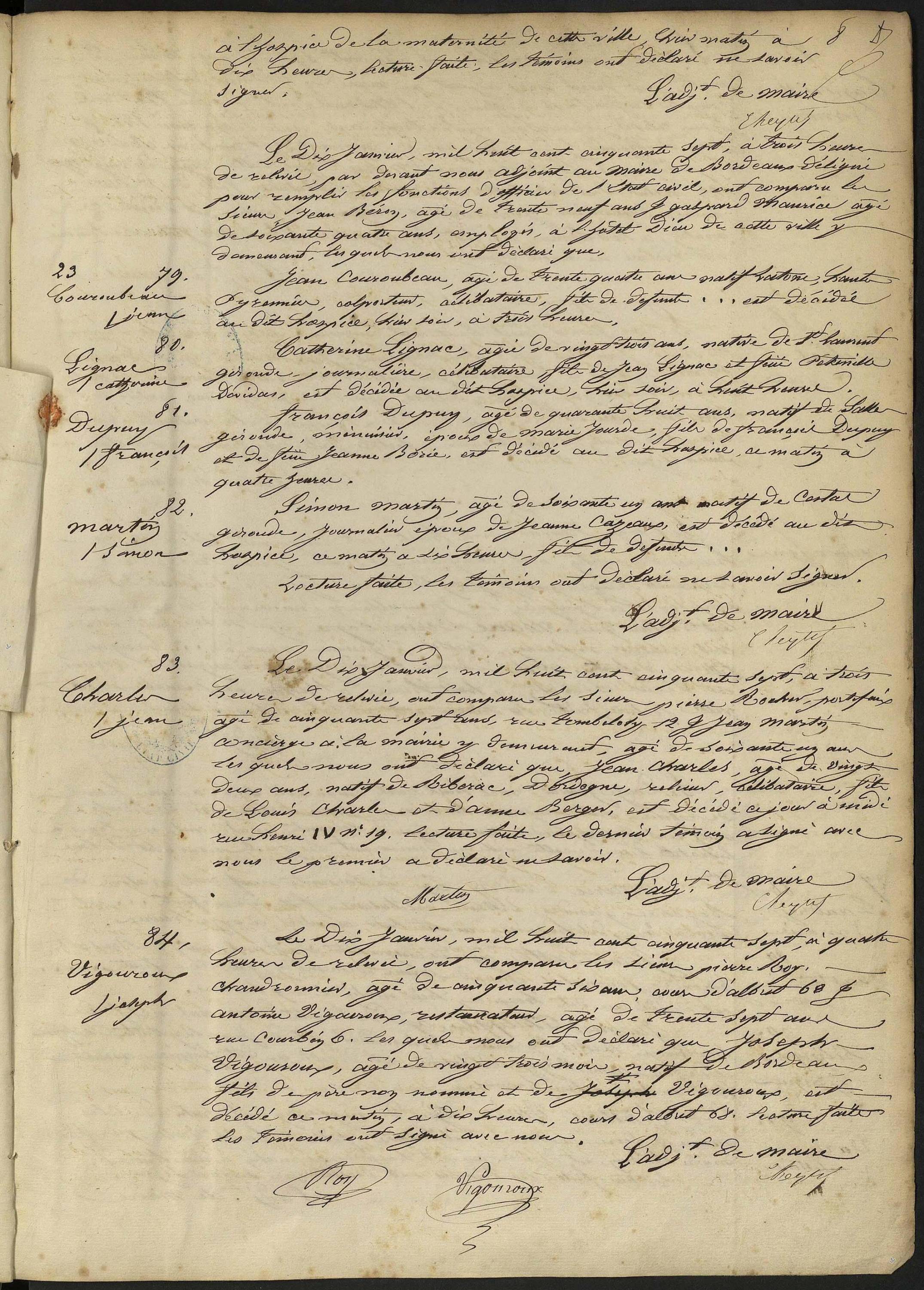 Le dix janvier, mil huit cent cinquante-sept, à trois heures, par devant nous adjoint au Maire de Bordeaux, délégué pour remplir les fonctions d’officier de l’État civil, ont comparu les sieurs Jean Béron, âgé de trente-neuf ans et Gaspard Maurice, âgé de soixante-quatre ans, employés à l’Hôtel-Dieu de cette ville y demeurant, lesquels nous ont déclaré que