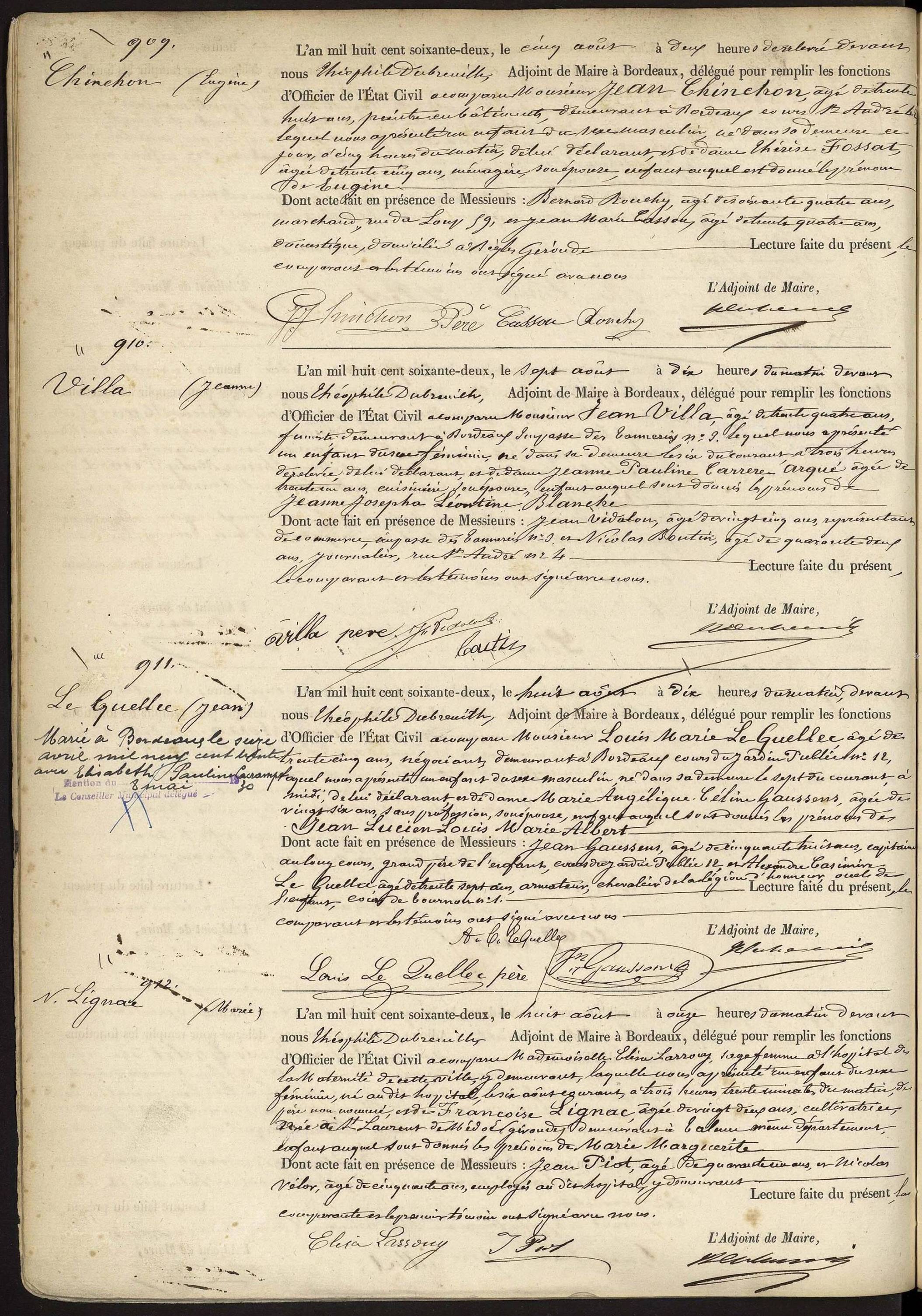 L’an mil huit cent soixante-deux, le huit août à onze heures du matin, devant nous Théophile Dubreuil Adjoint de Maire à Bordeaux, délégué pour remplir les fonctions d’Officier de l’État Civil a comparu mademoiselle Elisa Larrouy, sage femme à l’hôpital de la maternité de cette ville, y demeurant, laquelle nous a présenté un enfant de sexe féminin, né au dit hôpital, le six août courant, à trois heures trente du matin, de père non nommé et de