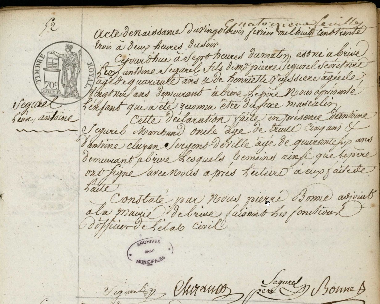 | Father | Pierre SÉGUREL, b. 5 Jan 1793, Brive-la-Gaillarde, Corrèze, France | |