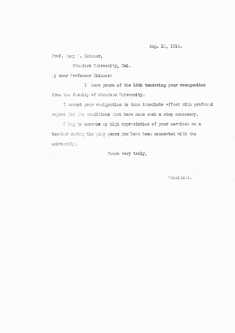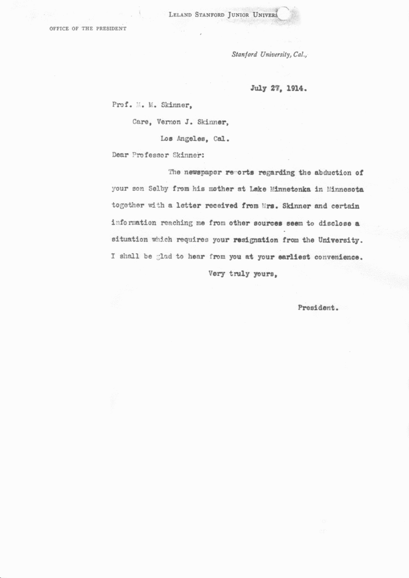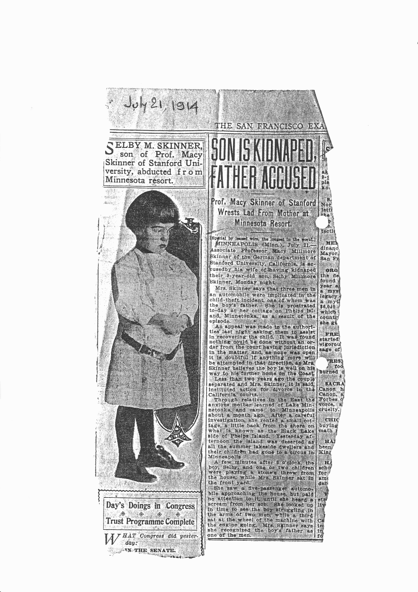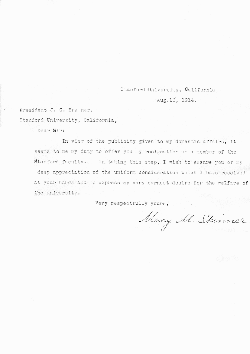 Macy Millmore Skinner graduated from Harvard University in 1894 (PhD). He attended the University of Heidelberg in Germany, probably studying economics. He apparently became well respected, worldwide, as an economist. From 1895 to 1914, he was professor in the German Department at Stanford University (California). A scandal (see doc1, doc2, doc3, doc4) forced him to resign suddenly in August 1914. He went to China where he was an economic advisor to Sun Yat-Sen. He came back to America, and went on to the University of Washington where he was Business Professor in the Economics Department and Dean of Men.