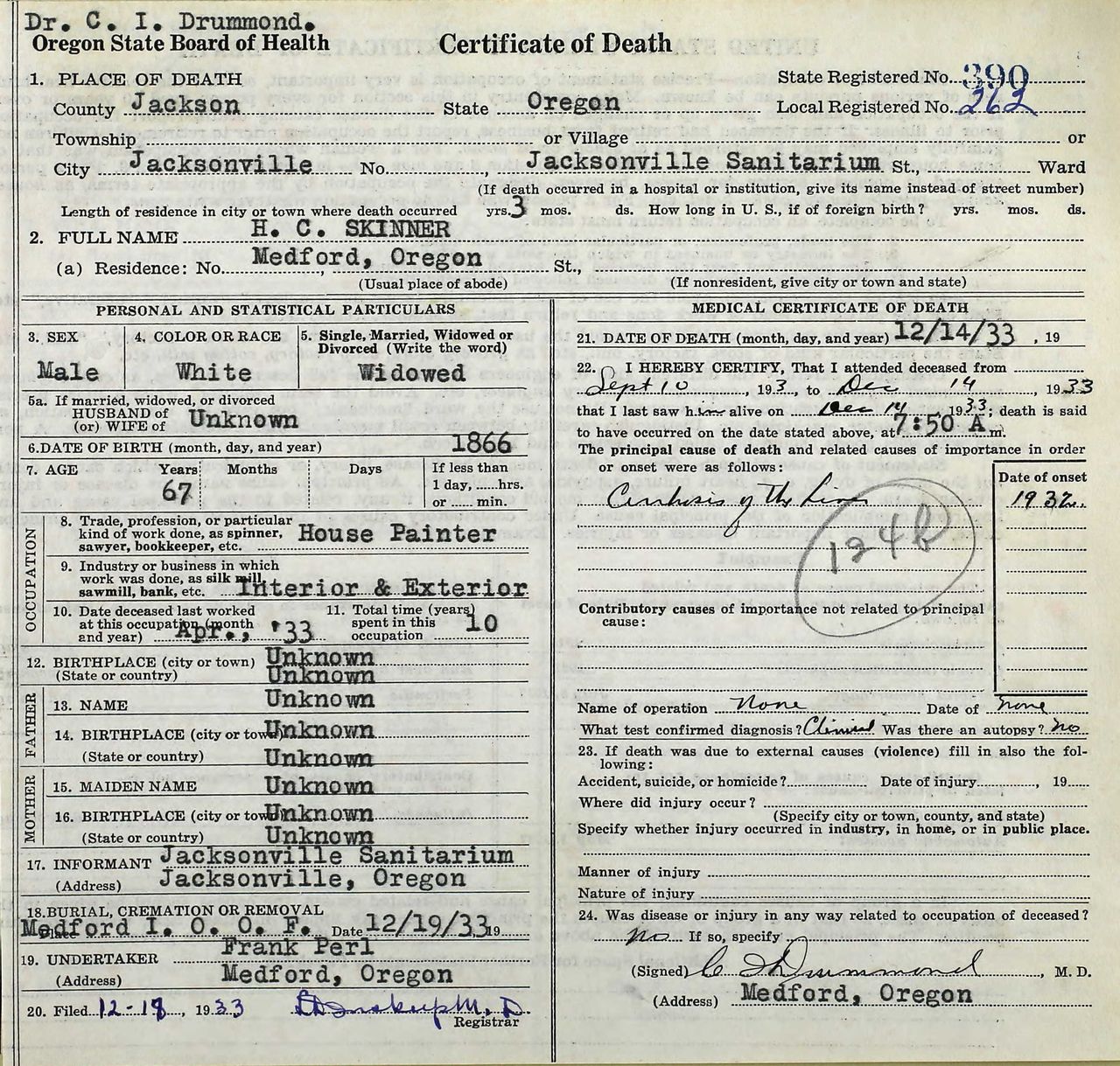 H. C. Skinner, 67, died at the Jacksonville sanitarium yesterday following an illness of three weeks. He is survived by two daughters. Mrs. L. E. Dufford of Muskogee, Okla. and Mrs.. H. B. Beardsley, Jr., of Abilene, Texas. Funeral service will be held In the Medford I. O. O. F. cemetery Monday afternoon at 2 o’clock. Rev. W. R. Baird will deliver the sermon with Perl funeral parlors conducting the funeral.